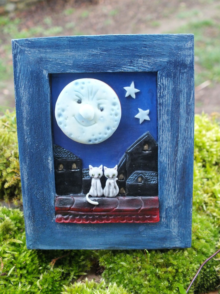 Cadre en bois peint décoré en pâte polymère avec nombreux détails ( chats, tuiles, lune phosphorescente ...)