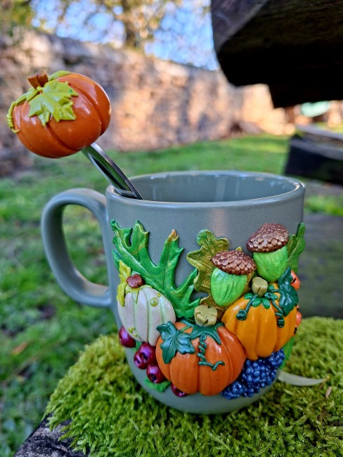 Création unique et automnale... support en bois, citrouille en pâte polymère vernie...