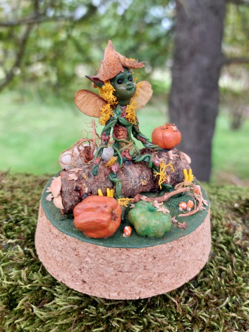 Création unique et automnale... support en bois, citrouille en pâte polymère vernie...