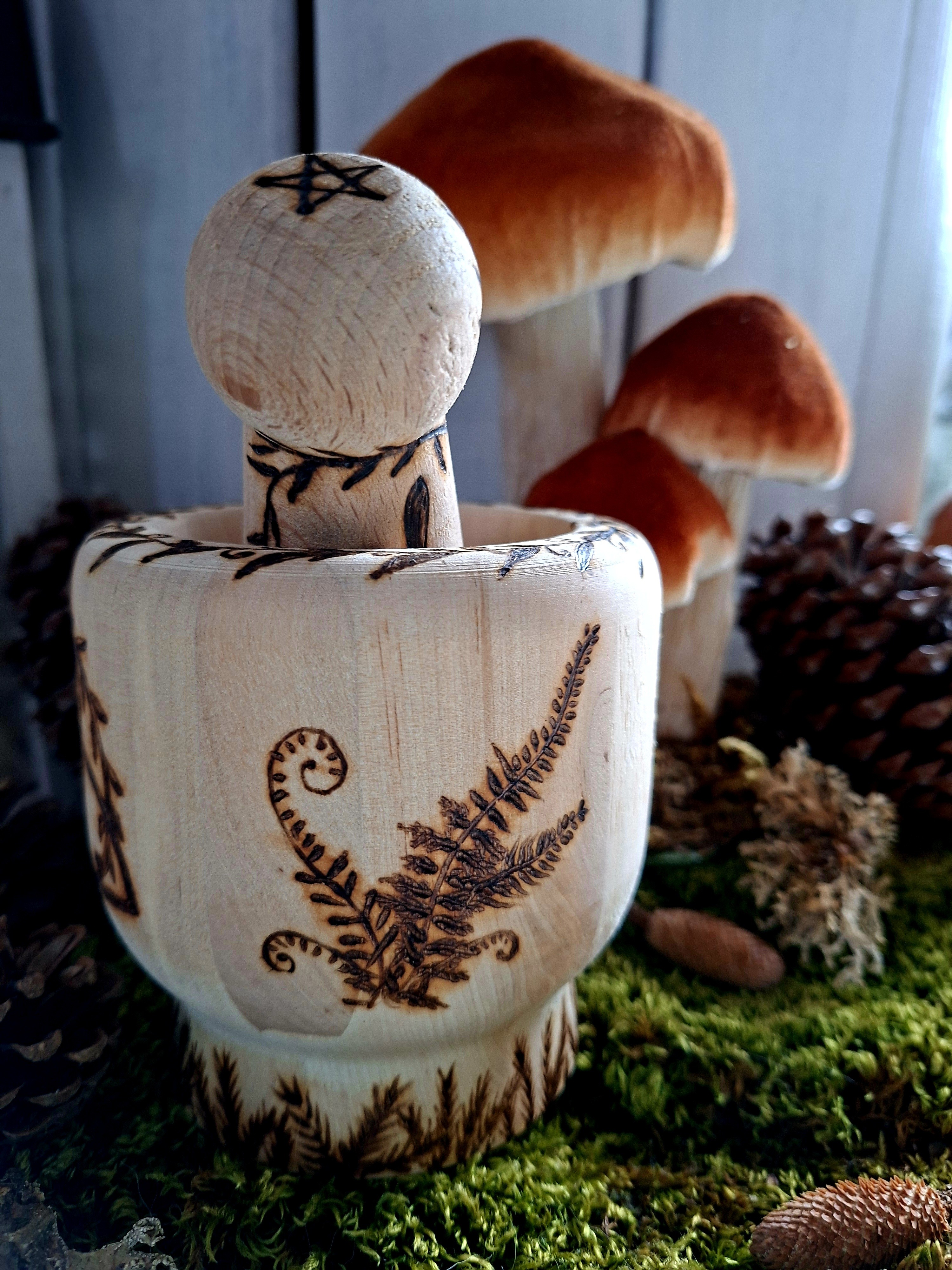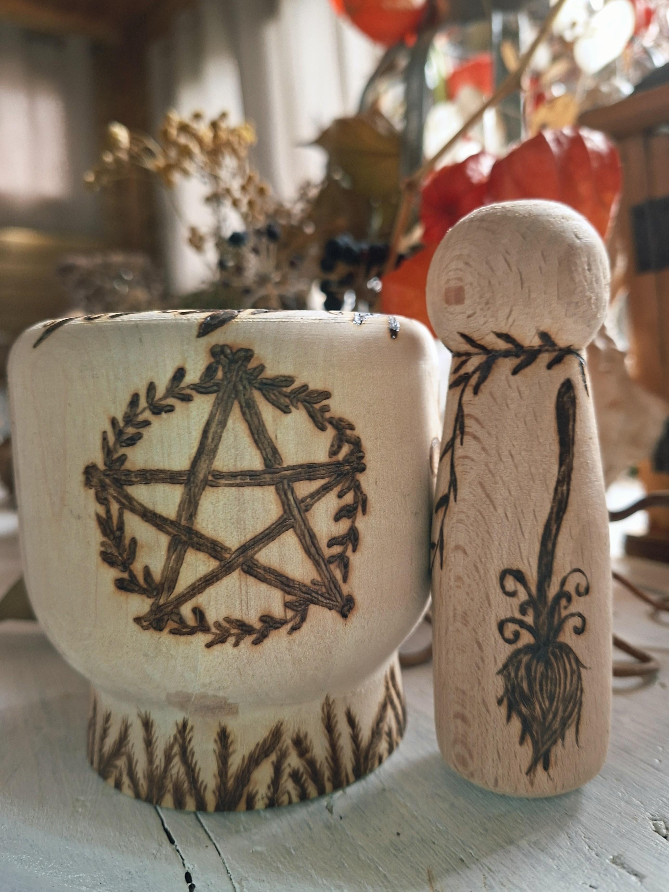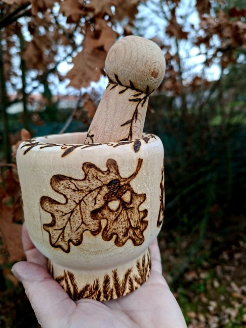 Mortier et pilon en bois de hêtre pyrogravés à la main...