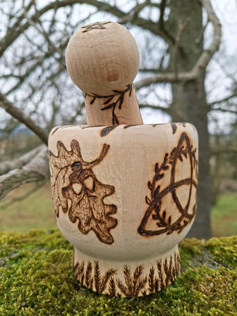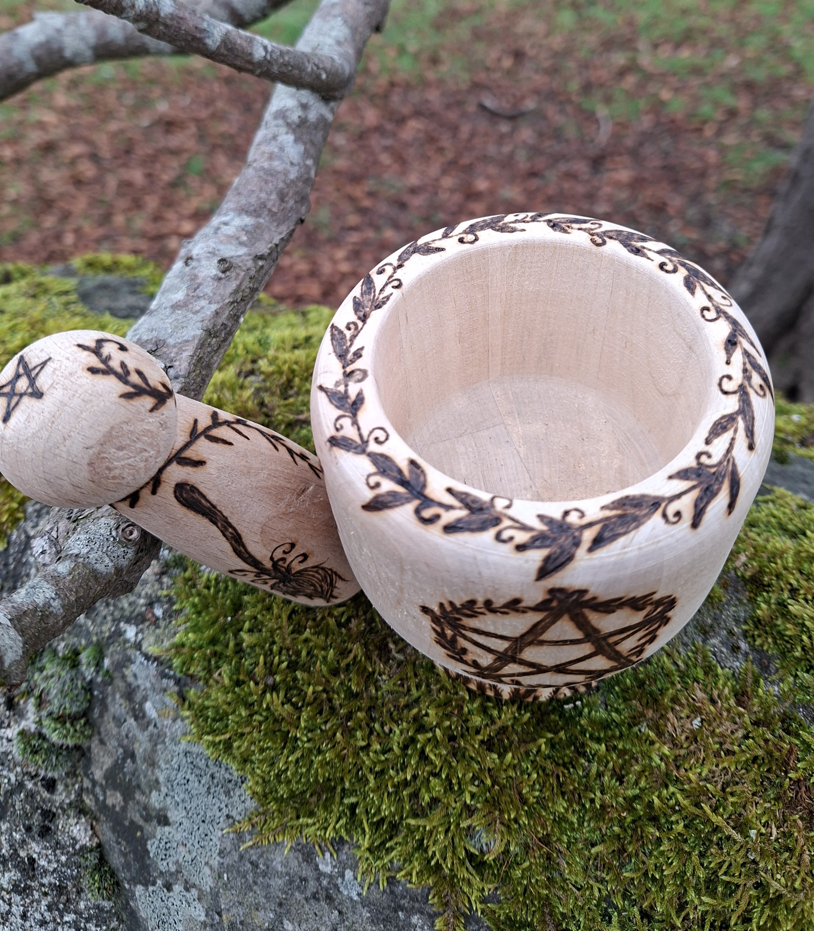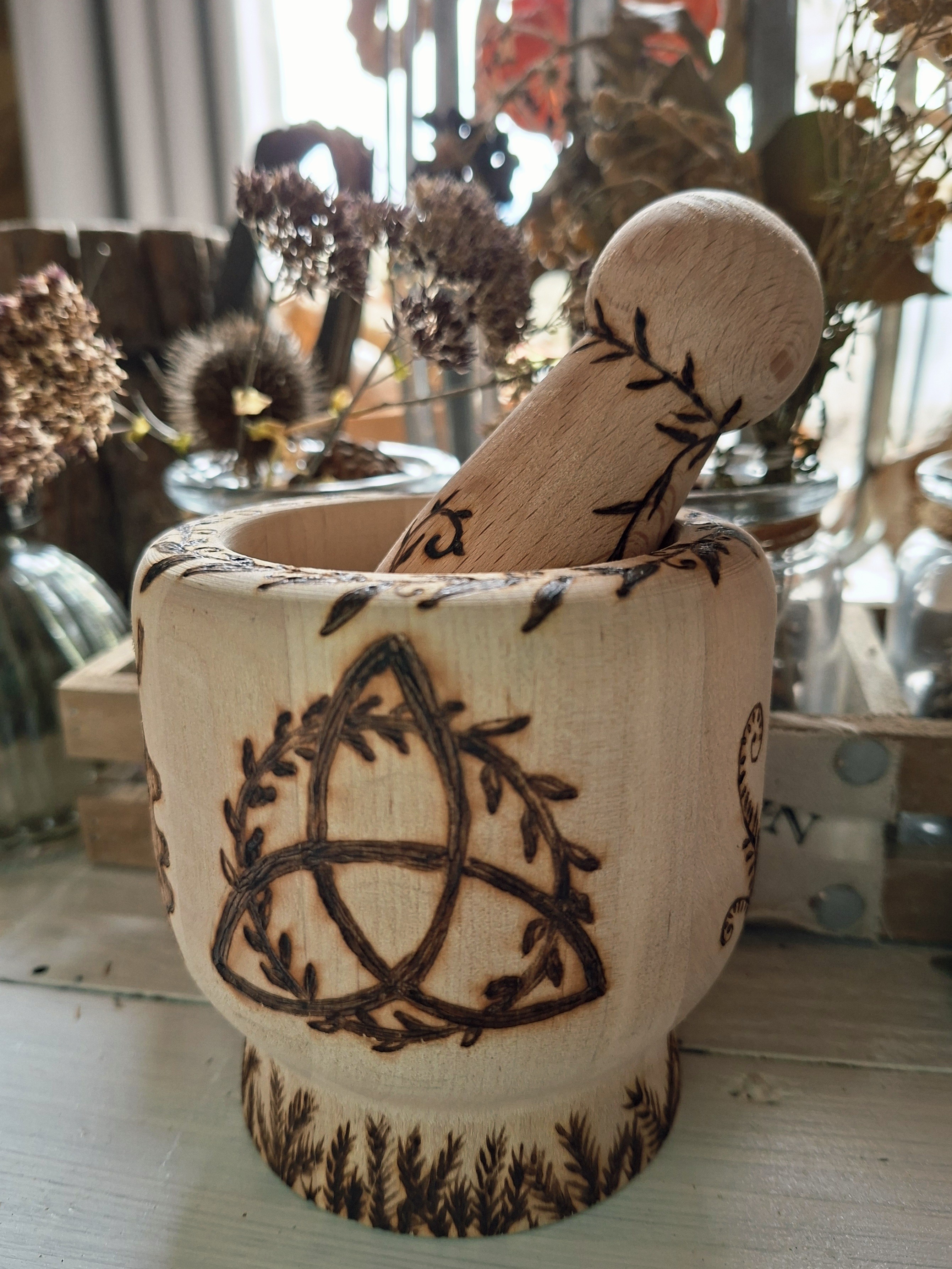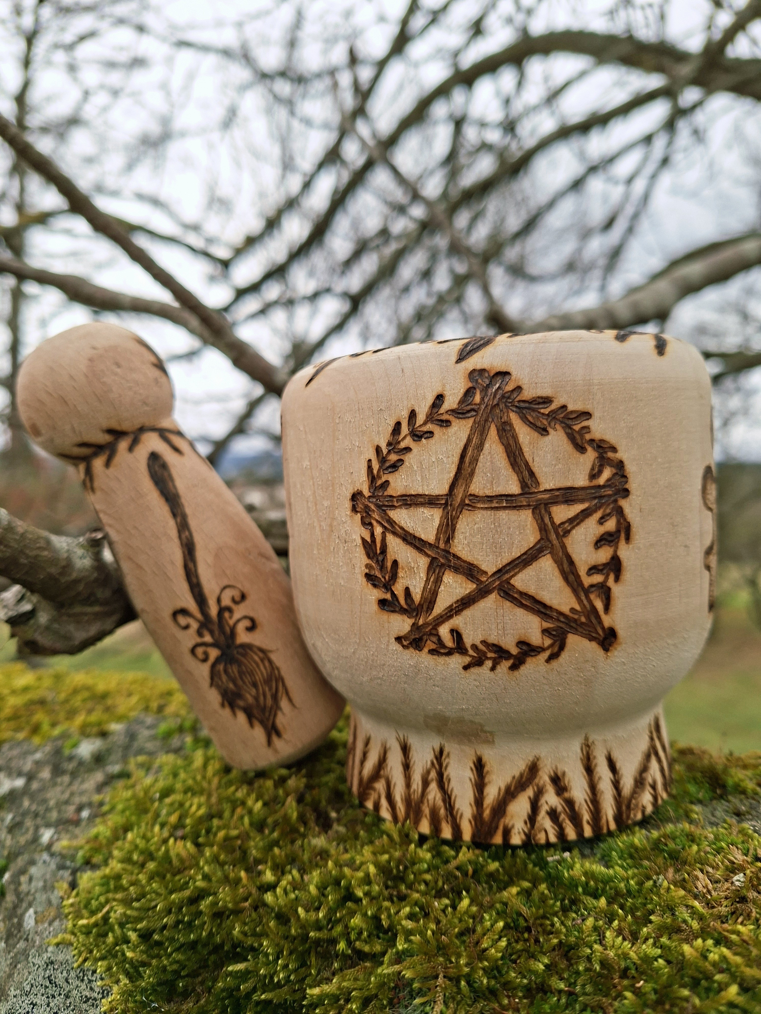 Mortier et pilon en bois de hêtre pyrogravés à la main...