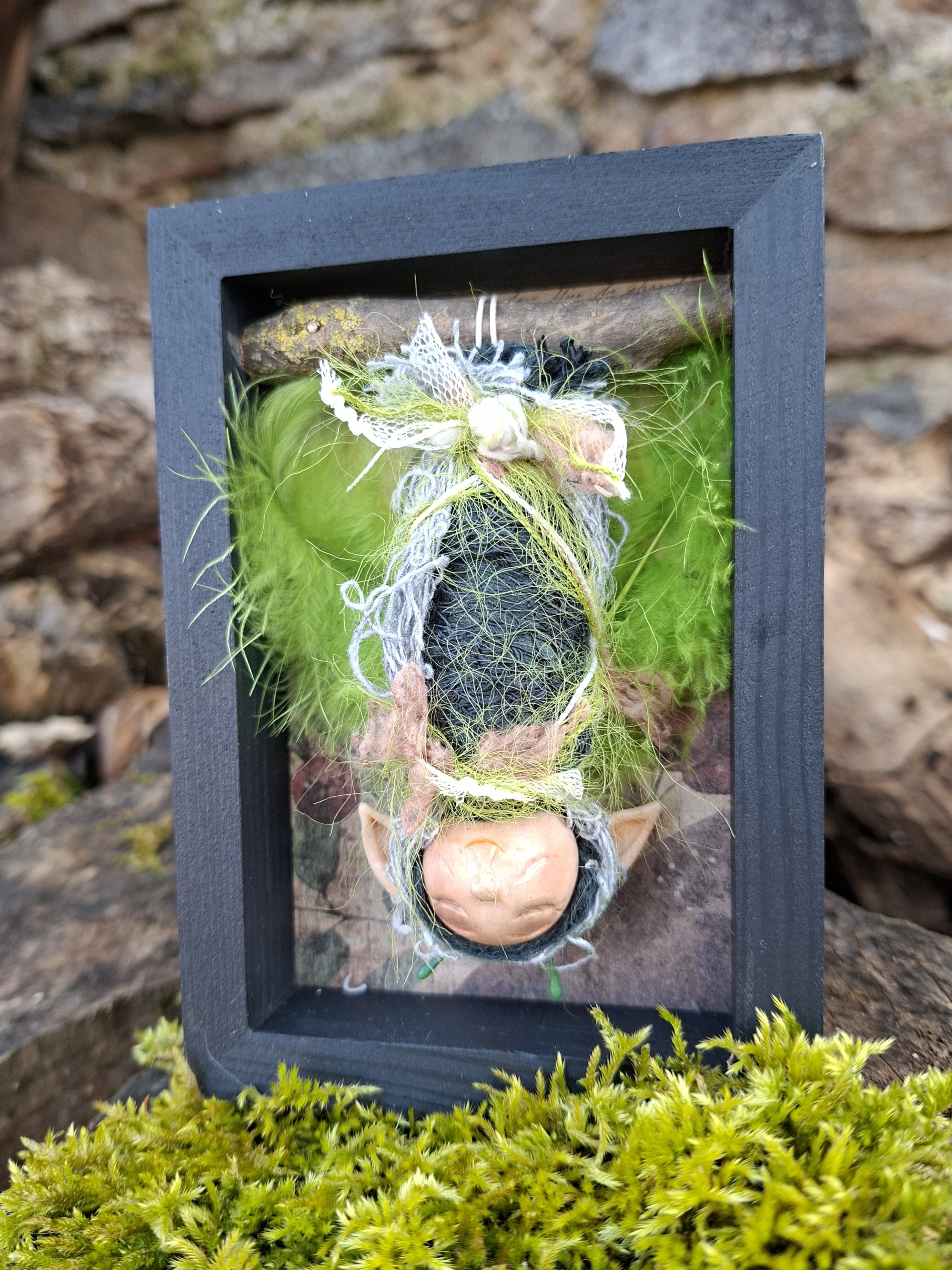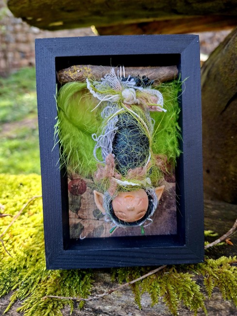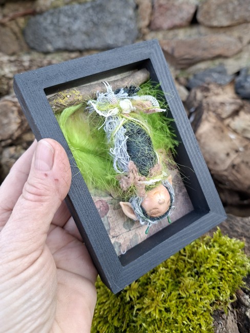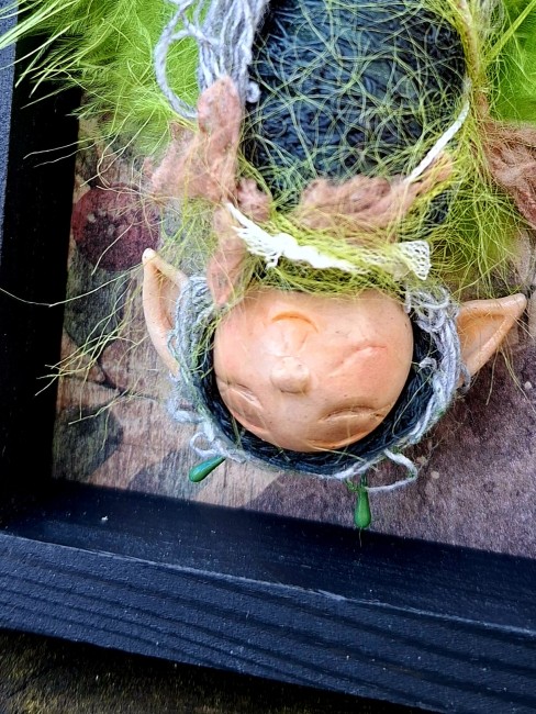 Cadre en bois peint... pâte polymére, plumes et divers tissus...