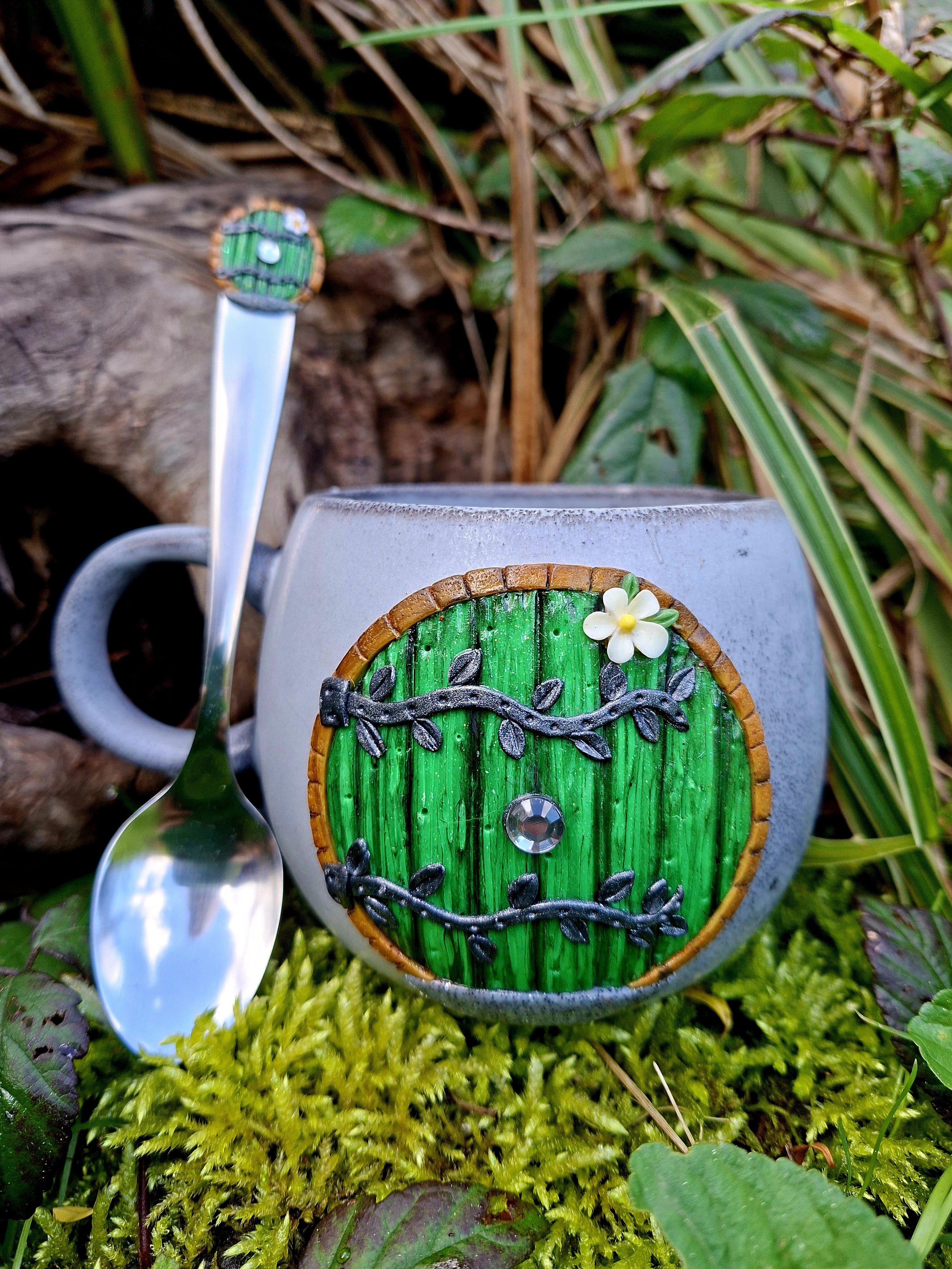 Mug en céramique et sa cuillère assortie ( en acier inoxydable) décorés en pâte polymére vernie...